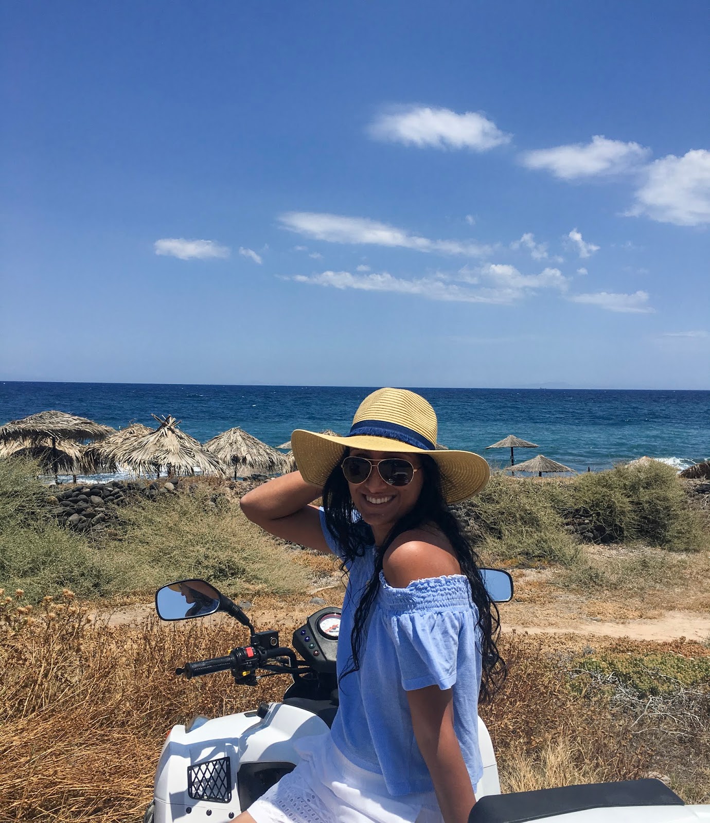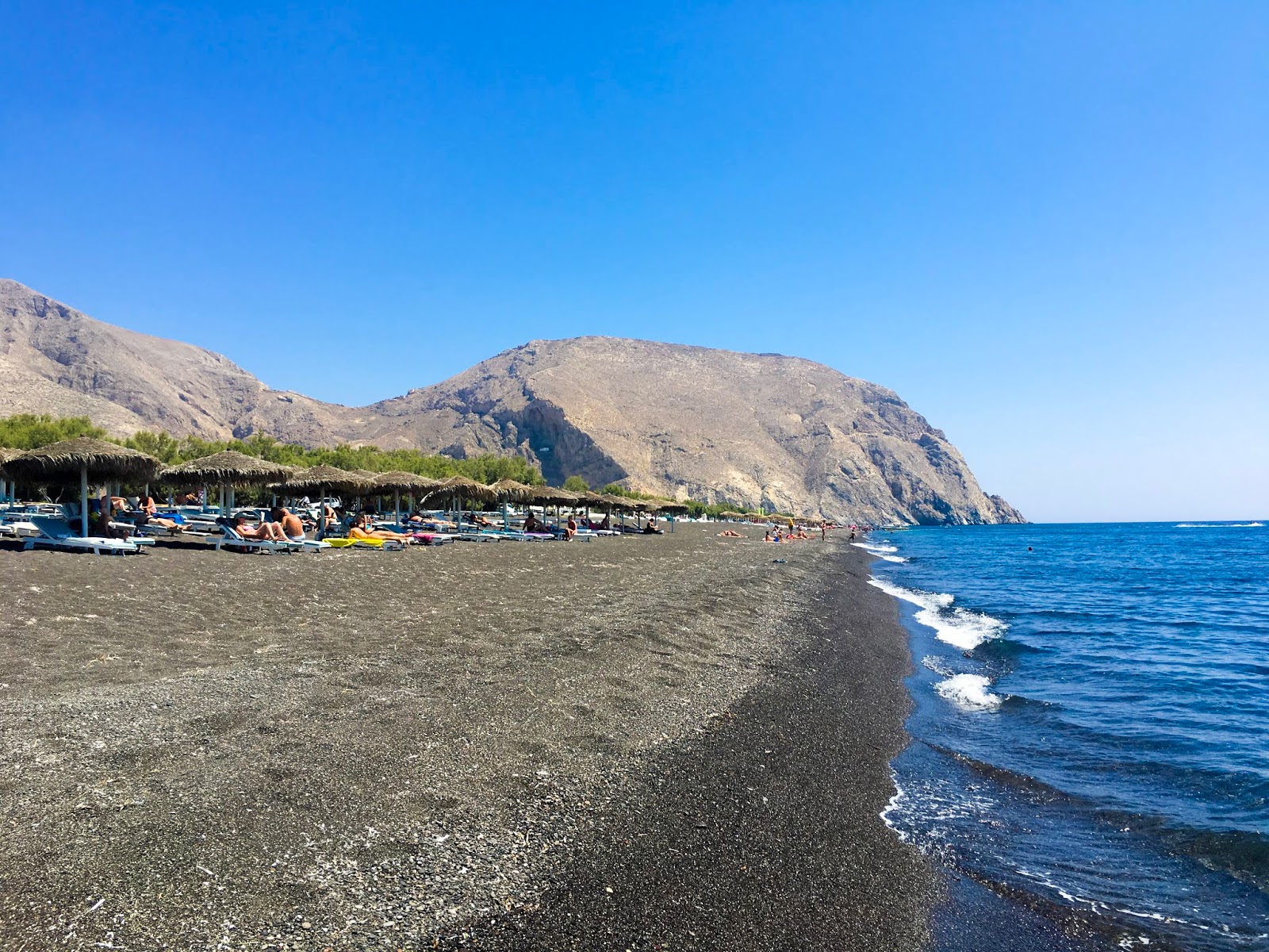 From the Red Sand beach we headed to Perissa Beach, a stretch of black sand beach with crystal clear water. The beach extends from Perissa to Perivolos where there are restaurants, hotels, cafes all along the strip. Our hotel has a sister property there that had full service on the beach. They also had a shuttle from the Vedema and back, but we had our ATVs still.